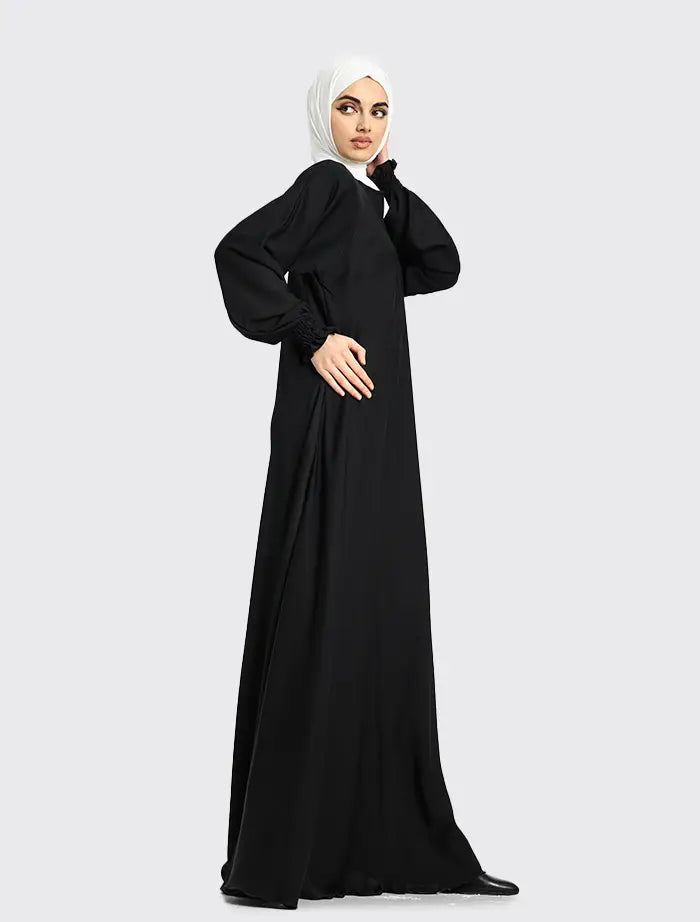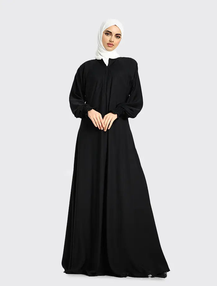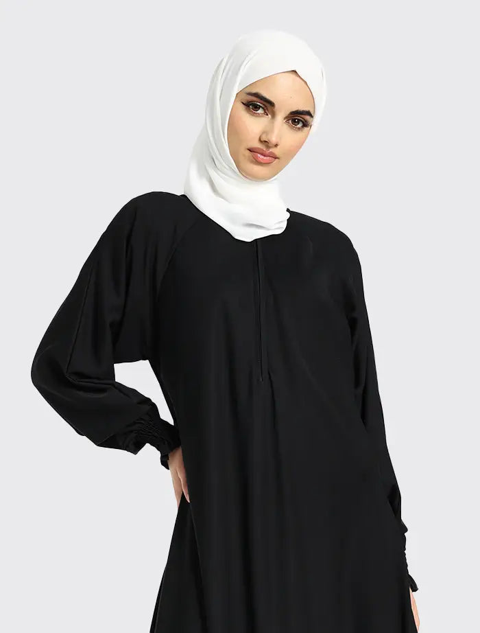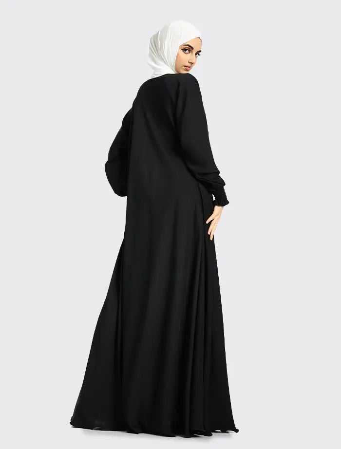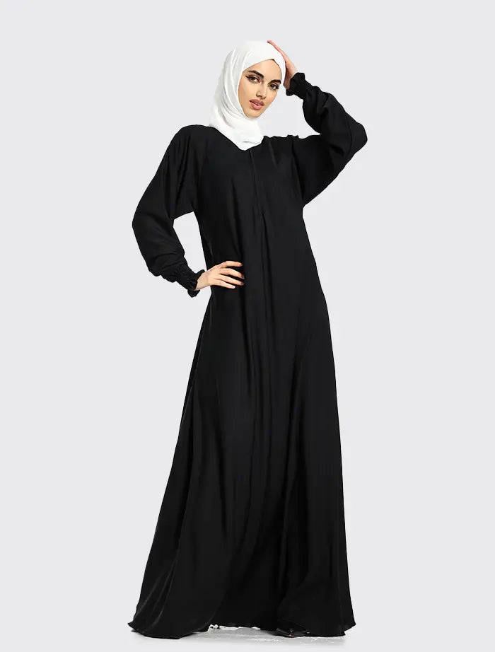 The Nida fabric compliments the full flare cut umbrella bottom⋅ The style features a round neckline with a concealed zip on the front⋅ The sleeves finish with an elasticated cuff⋅ This abaya is perfect for maternity and everyday wear⋅