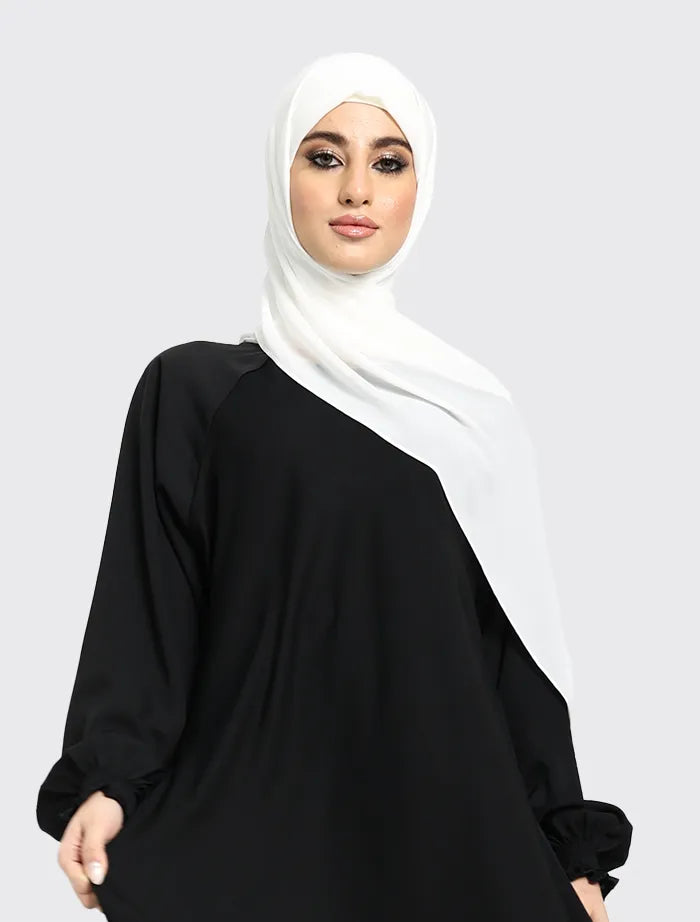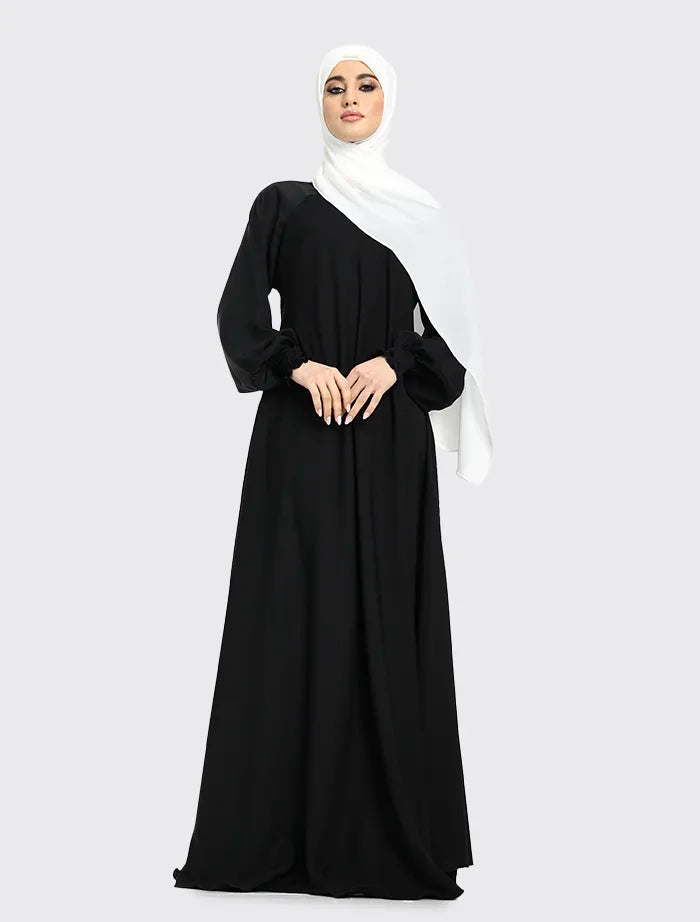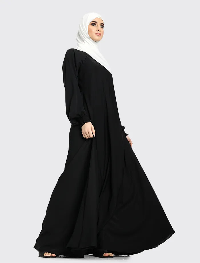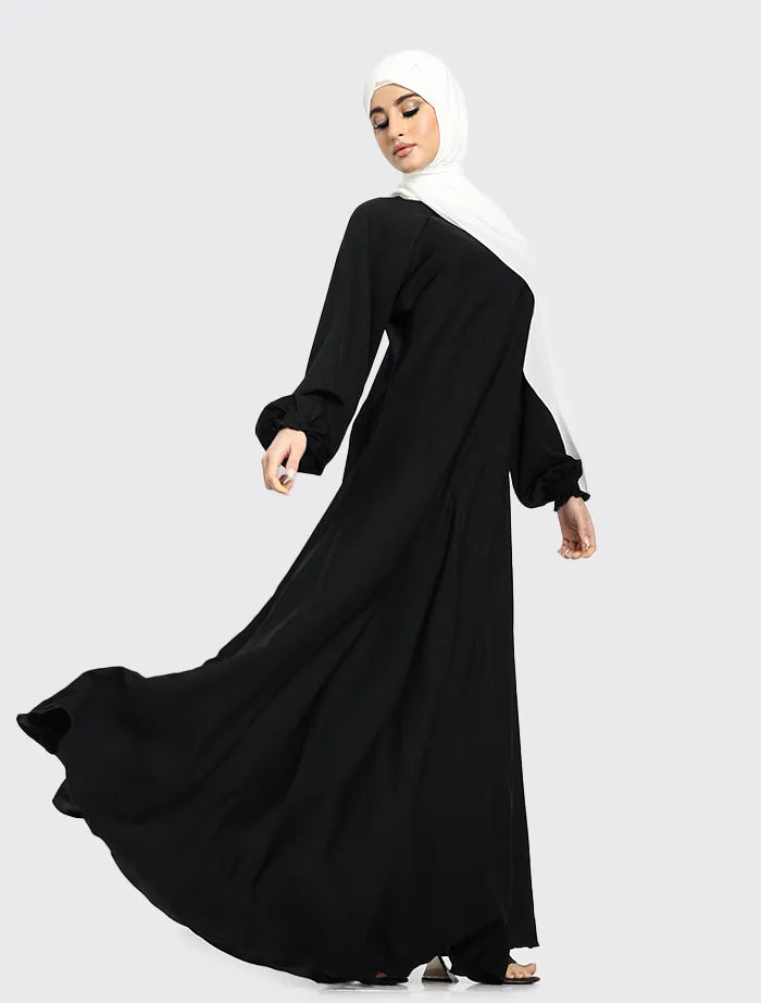 The Nida fabric compliments the full flare cut umbrella bottom⋅ The style features a round neckline with a concealed zip on the shoulder seam⋅ The sleeves finish with an elasticated cuff⋅ This abaya is perfect for everyday wear⋅